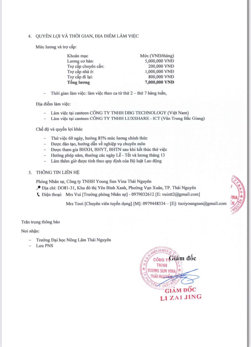 Công ty TNHH YOUNG SUN VINA THÁI NGUYÊN tuyển dụng nhân sự