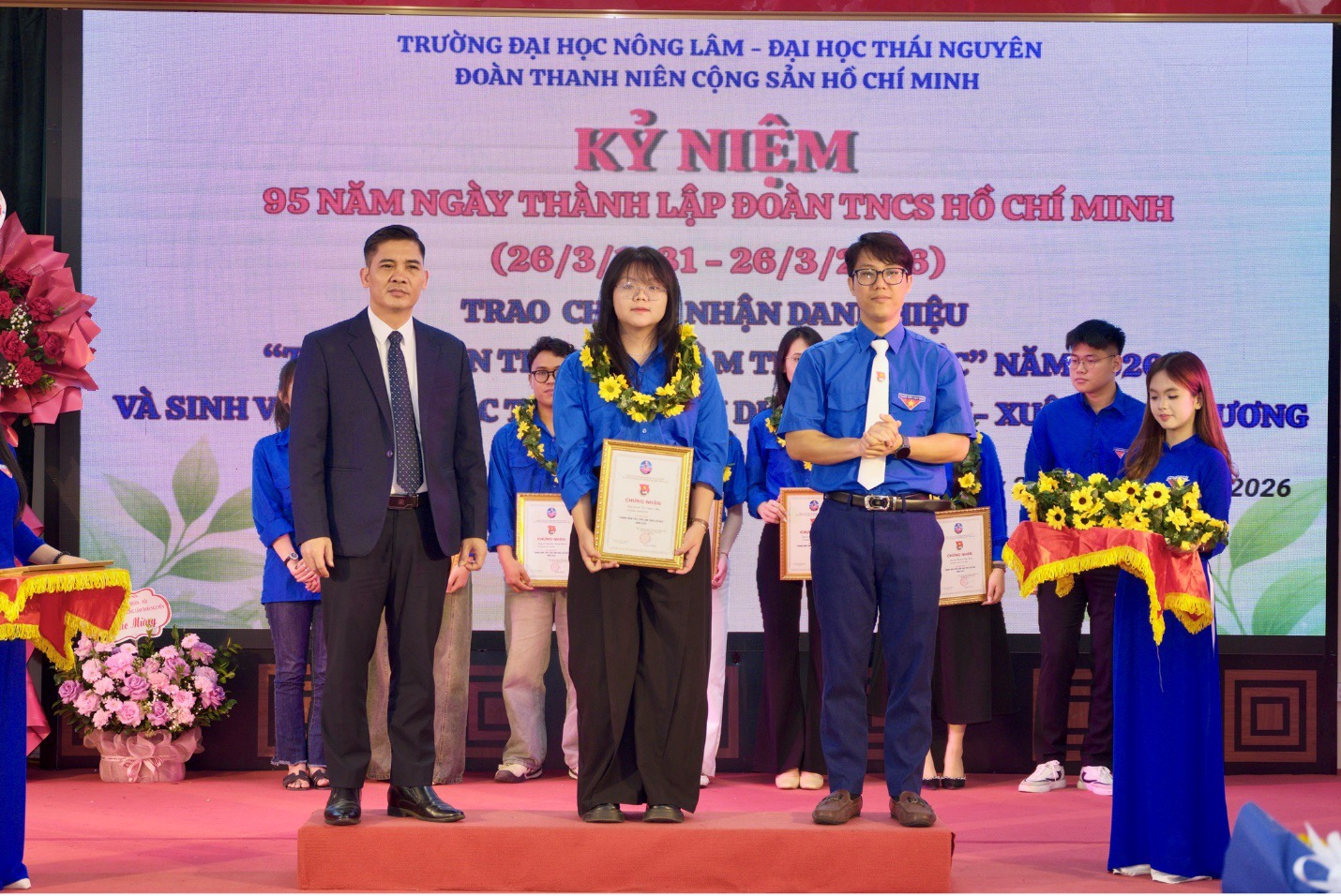 Sáng ngày 22/03/2026, tại Phòng họp A4, Đoàn trường Đại học Nông Lâm - Đại học Thái Nguyên đã long trọng tổ chức Chương trình Kỷ niệm 95 năm Ngày thành lập Đoàn TNCS Hồ Chí Minh (26/3/1931 – 26/3/2026). Buổi lễ là dịp để các thế hệ cán bộ Đoàn cùng nhau ôn lại chặng đường 95 năm xây dựng và trưởng thành của Đoàn TNCS Hồ Chí Minh; đồng thời khơi dậy niềm tự hào, ý chí và trách nhiệm của tuổi trẻ trong giai đoạn mới. Tại buổi lễ, nhiều sinh viên tiêu biểu của Viện được vinh danh với danh hiệu Thanh niên tiên tiến làm theo lời Bác.